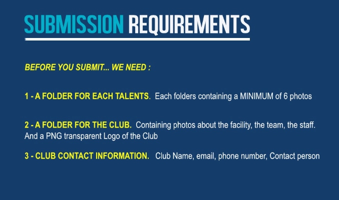 We need a folder for each Talents and the Club info - competition results and all editorials you want included in the magazine. You can send us a Dropbox or WeTransfer link to MagazinePublishingApplication@gmail.com